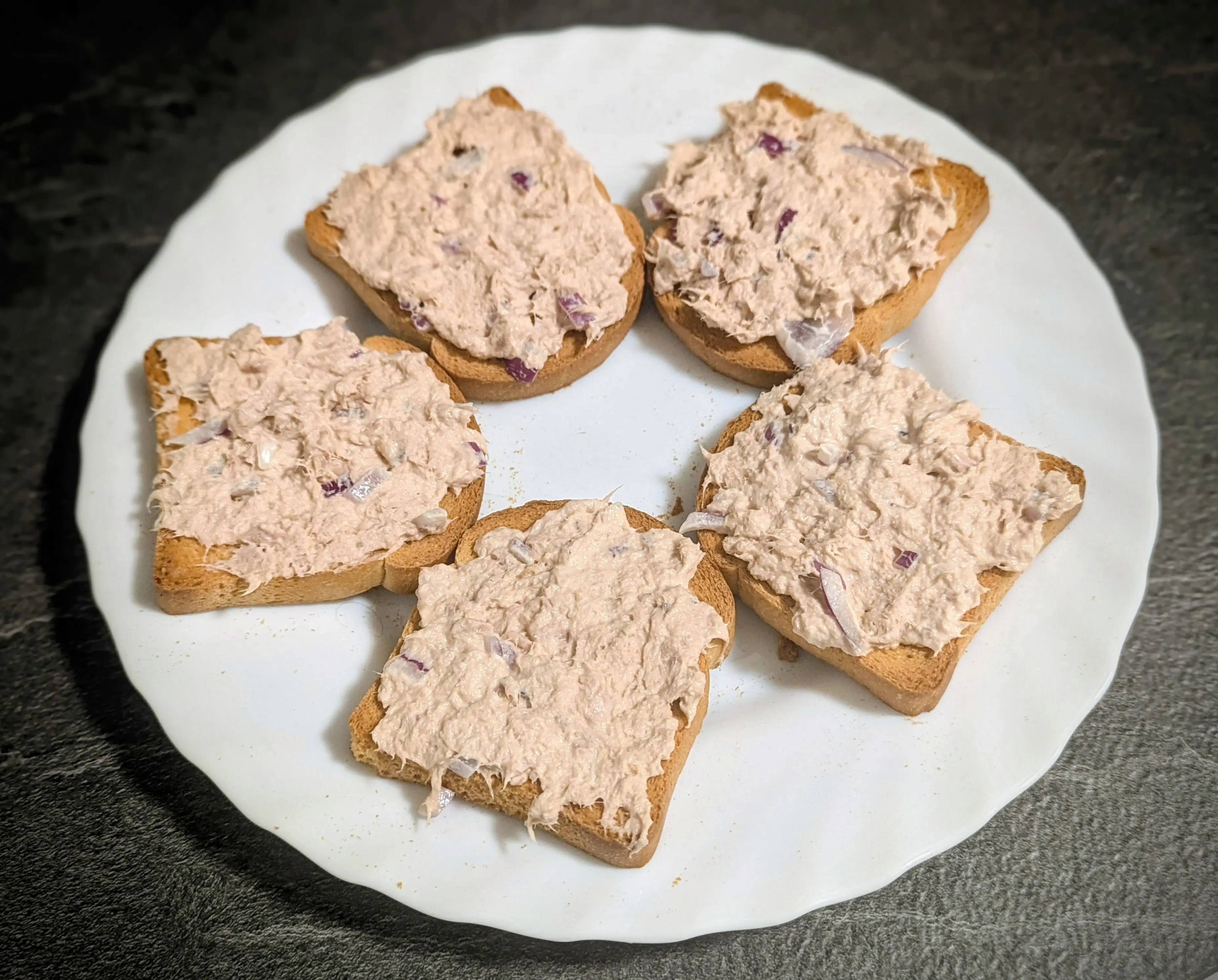 Einfach | Fisch | Snacks | omnivorDiese Thunfisch-Pasta-Schnittchen sind der perfekte Snack für zwischendurch: Eine cremige Mischung aus Thunfisch, Frischkäse und Mayonnaise, verfeinert mit fein gewürfelten Zwiebeln und einer Prise Zitronensaft, wird auf knusprigen Zwieback-Stücken angerichtet. Schnell zubereitet und unwiderstehlich lecker – ideal für Partys, Buffets oder als schnelle Mahlzeit!
