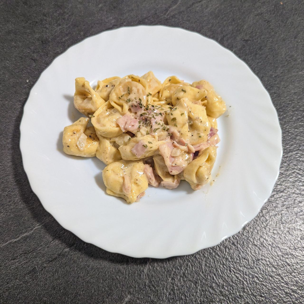 Tortellini dazugeben und ca 3 Minuten in Sahnesauce bei mittlere Hitze köcheln lassen